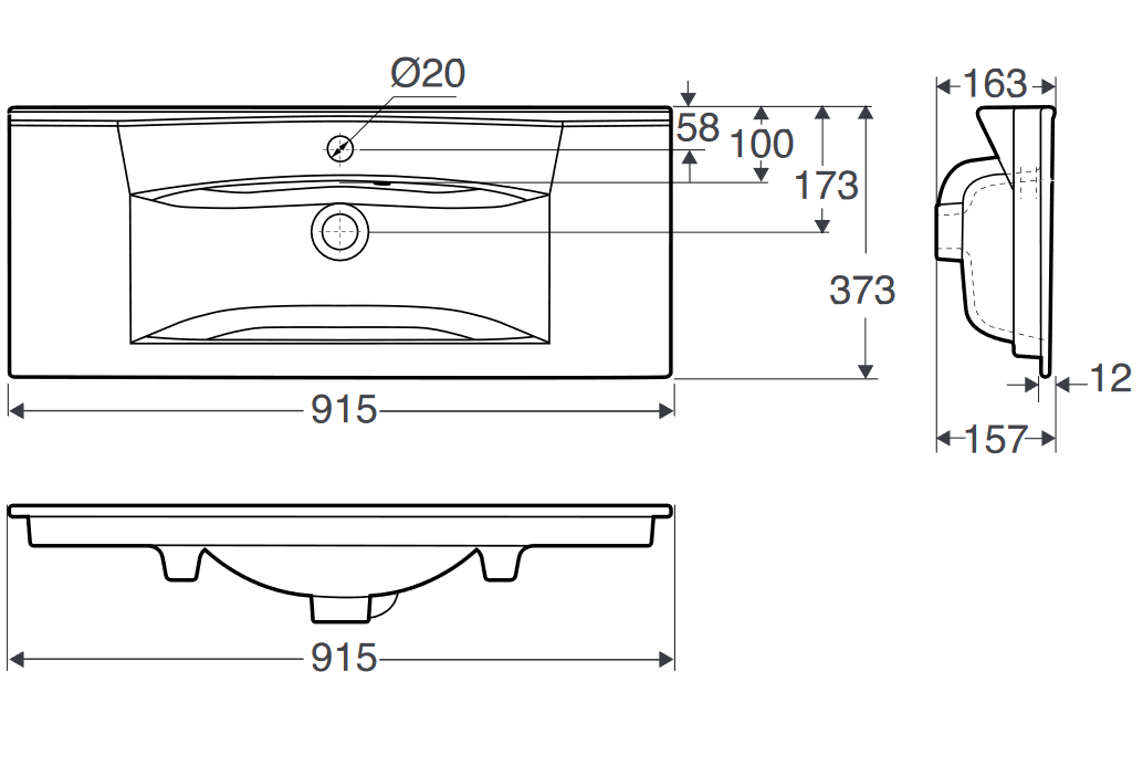Vasken er 916 x 374 x 15 mm, hanehul på Ø35mm og er med overløb.