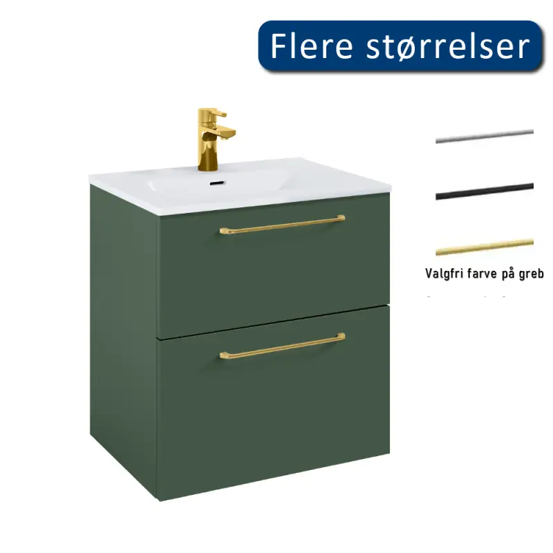 Mirall Hue 3 – 60 cm badmøbel i Skovgrøn med 2 skuffer og porcelænsvask
