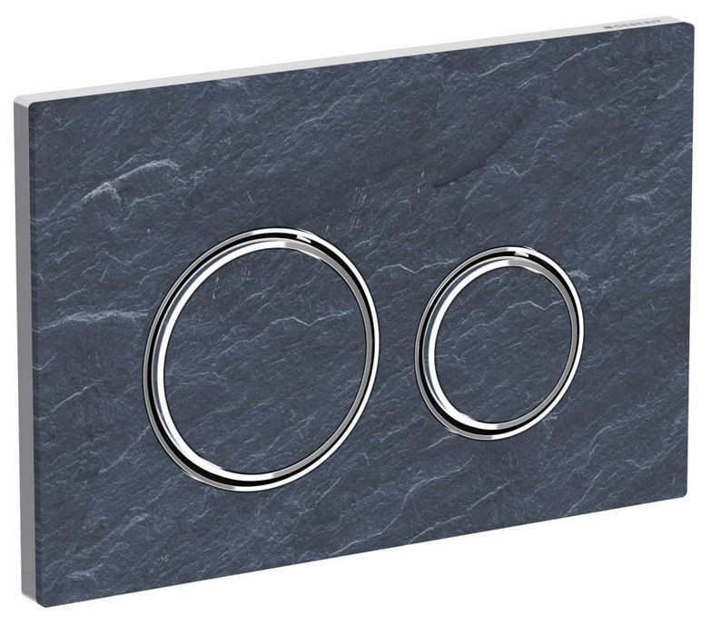Geberit Sigma 50 i skifer er en betjeningsplade, der kombinerer naturlige materialer med moderne funktionalitet. Overfladen i skifer giver en unik struktur og et eksklusivt, råt udtryk, som adskiller sig fra de klassiske glasmodeller. De runde trykknapper fremhæves af blanke designringe i krom, der tilfører en elegant kontrast til den mørke, stentekstur.