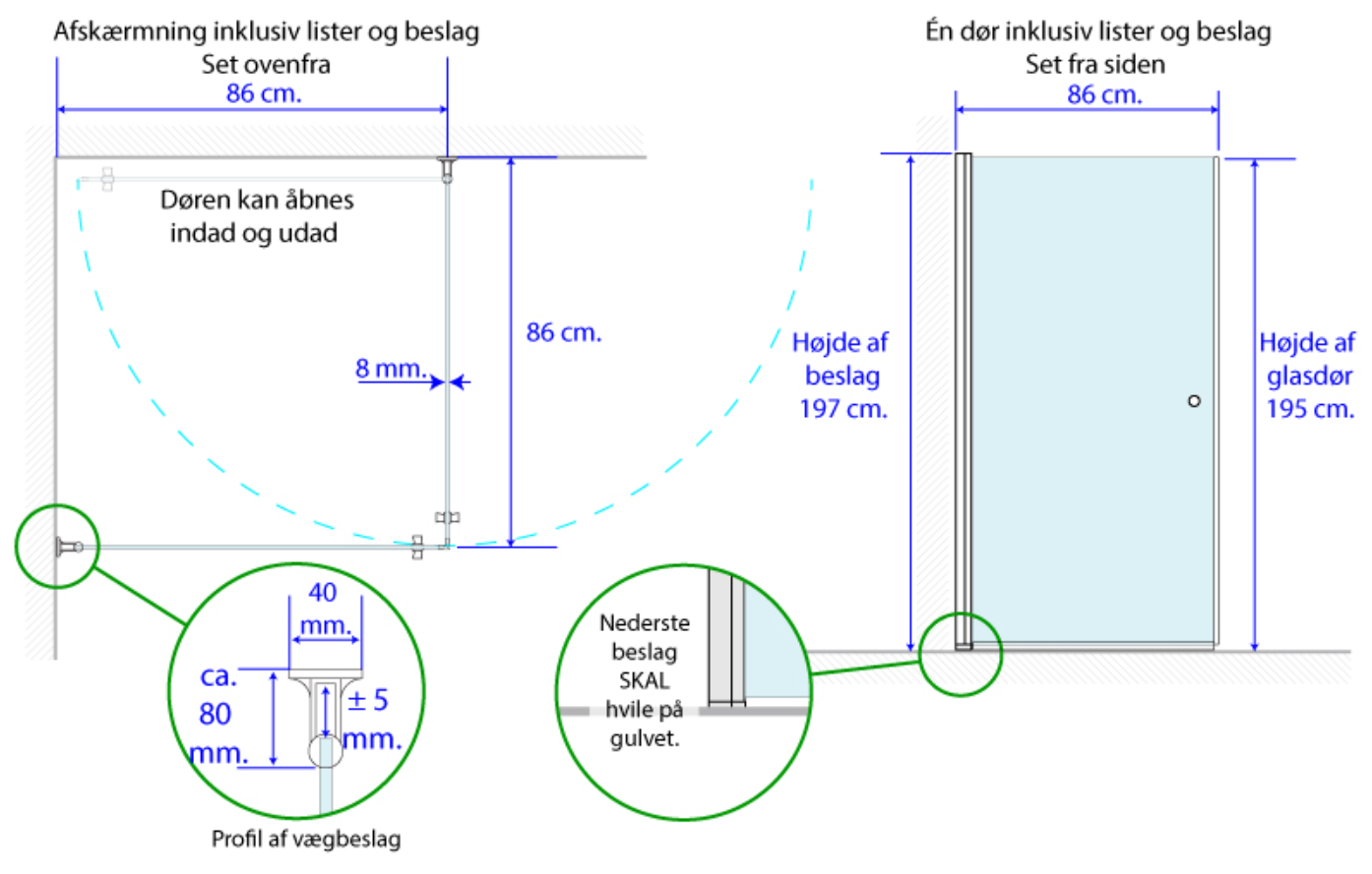 Døren er med hævesænke funktion med hængsler i forkromet metal. Døren monteres på aluminiumsprofiler
