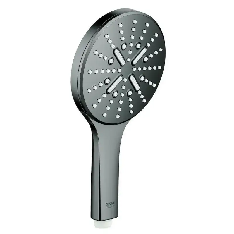 Håndbruseren har en grå overflade med en poleret tekstur.
