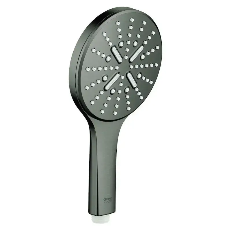 Håndbruseren har en grå overflade med en børstet tekstur.