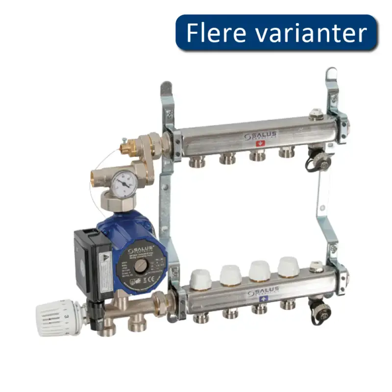 Uniten er komplet med gulvvarmefordeler, cirkulationspumpe og gulvvarmeshunt.