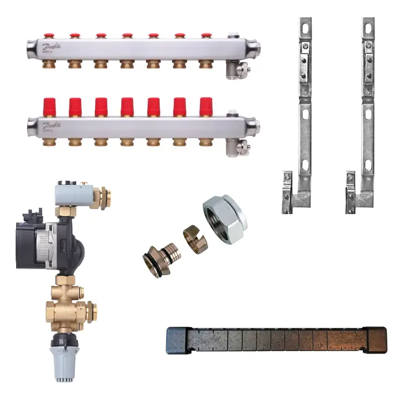 gulvvarme fordelerrør 7 kredse, komplet gulvvarmepakke, Danfoss gulvvarmeshunt, gulvvarme manifold, gulvvarme fordelerrør sæt, Danfoss Icon2 tilbehør, gulvvarme installation