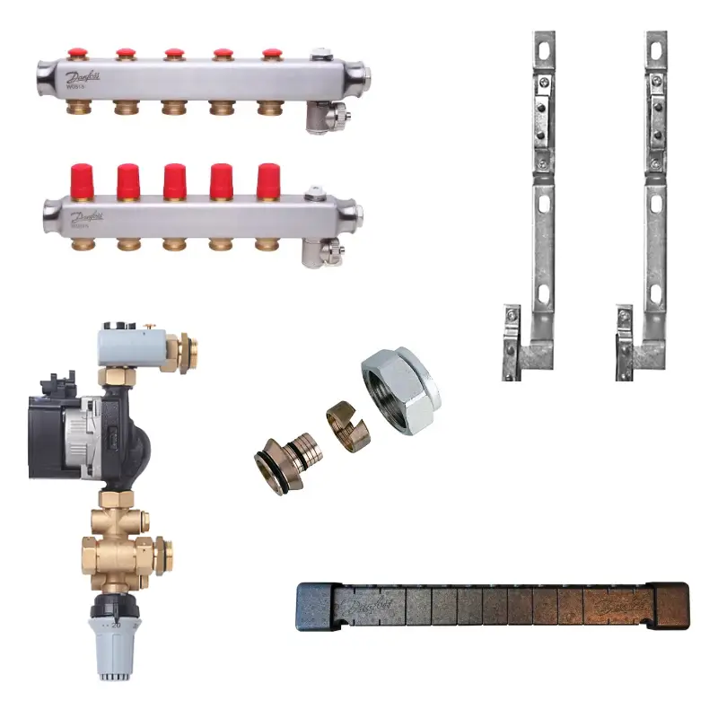 gulvvarme fordelerrør 5 kredse, komplet gulvvarmepakke, Danfoss gulvvarmeshunt, gulvvarme manifold, gulvvarme fordelerrør sæt, Danfoss Icon2 tilbehør, gulvvarme installation