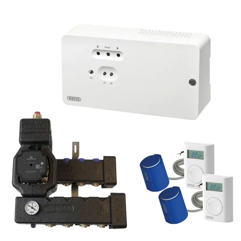 Pakken består af tre centrale komponenter, som tilsammen udgør hjertet i et moderne gulvvarmeanlæg: