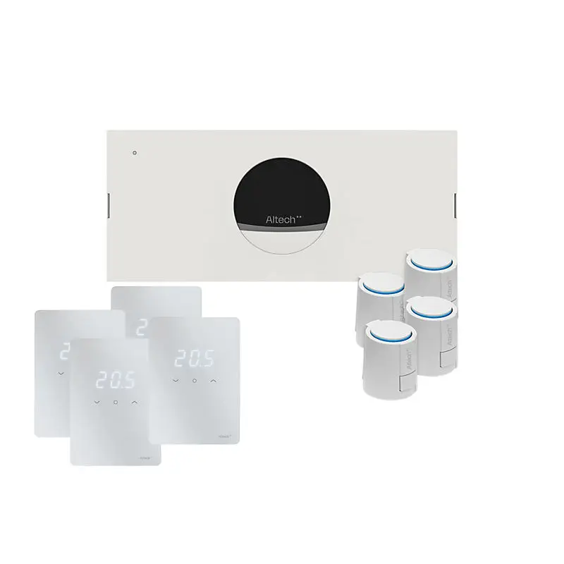 Denne Altech Pro gulvvarmepakke til 4 kredse er en oplagt løsning til dig, der allerede har et Altech fordelerrør og ønsker at opgradere til en nyere og mere brugervenlig styring. Pakken gør det muligt at forny dit eksisterende gulvvarmesystem uden at skulle udskifte hele anlægget.