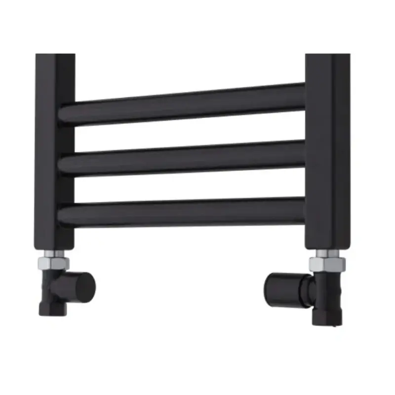 TVS 110 CR i sort er et godt valg til håndklædetørrere, hvor du ønsker en enkel løsning med pænt udtryk. Ventilsættet fungerer godt til både fjern- og centralvarme, og den lige model passer til mange forskellige installationer.