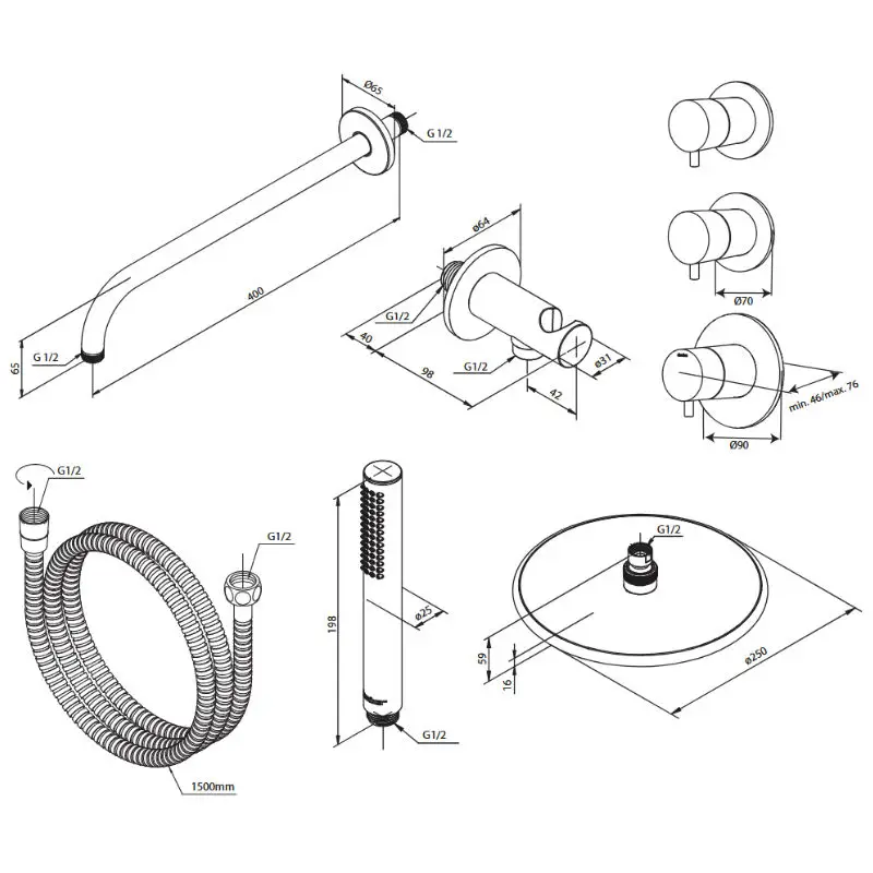 Både hoved- og håndbruser har RubClean gummidyser, som gør det nemt at fjerne kalkaflejringer. Den keramiske omskifter og indbyggede skoldningsspærre sikrer stabil drift og lang levetid. Med en indbygningsdybde på 75–104 mm passer systemet til de fleste vægtyper, hvilket gør installationen enkel og fleksibel.