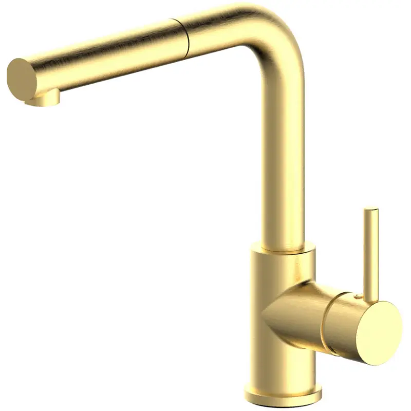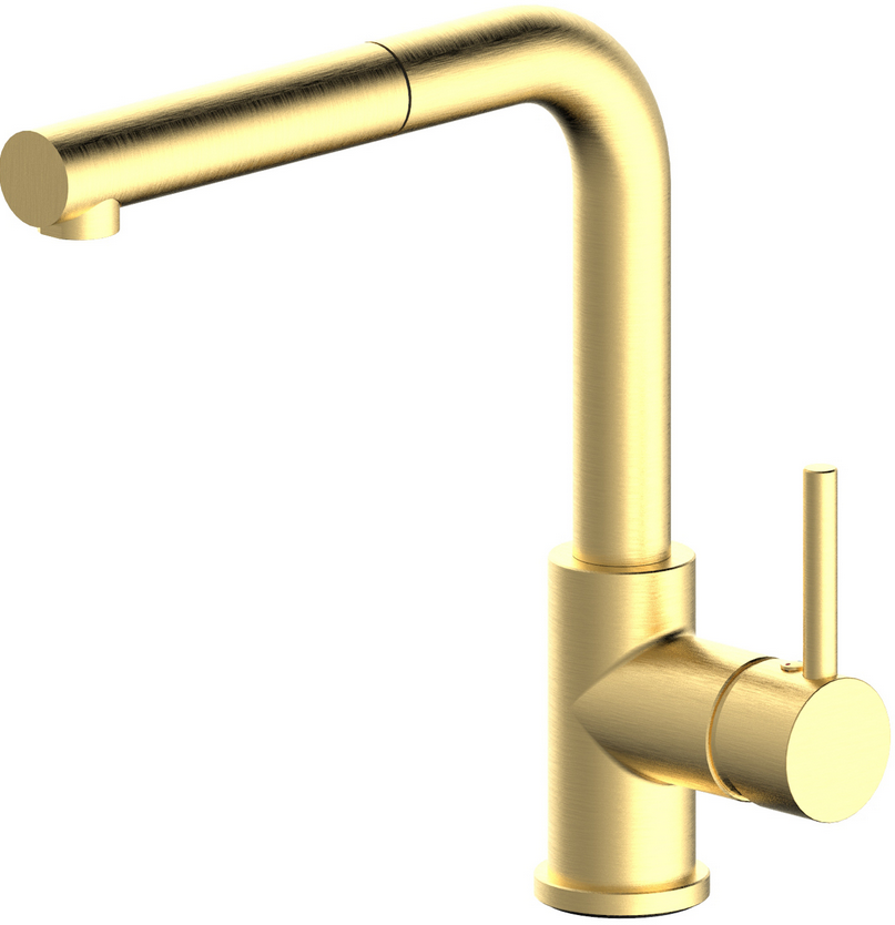 Køkkenbatteri med høj L-formet tud, og praktisk udtræksbruser