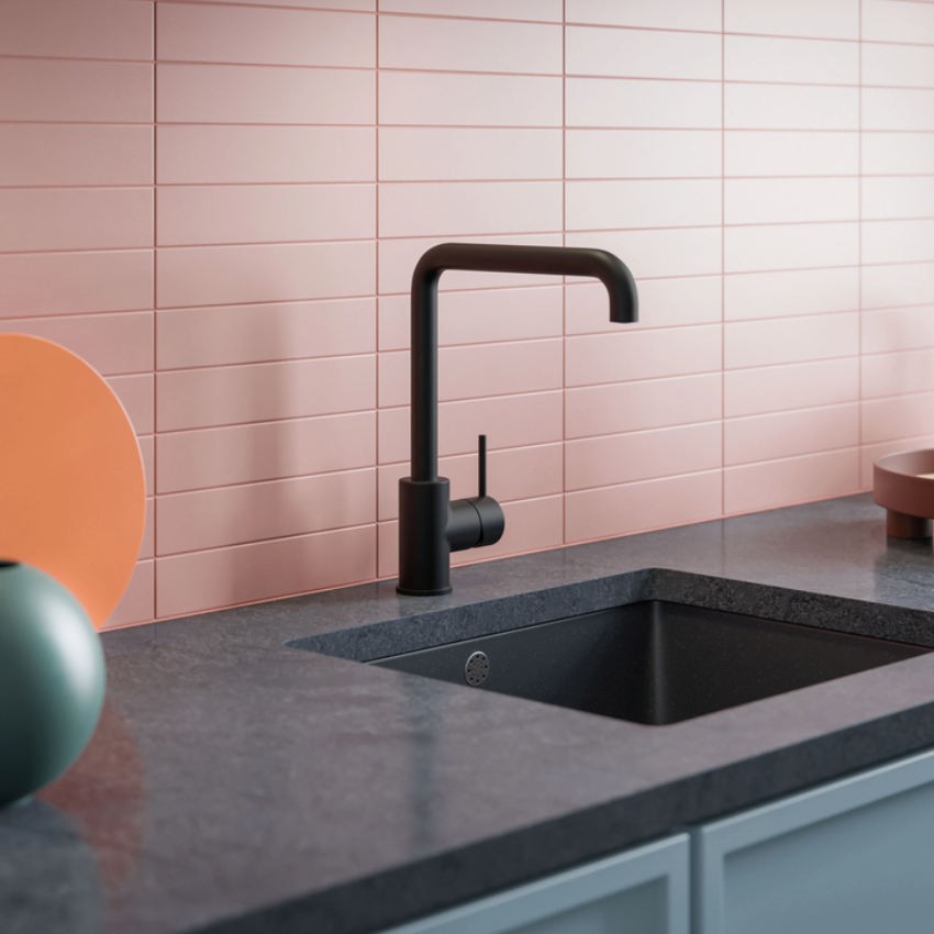 Den matte sorte finish skaber en flot kontrast til lyse bordplader og hvide elementer, men passer også perfekt sammen med mørke stenmaterialer, beton og rustikke træsorter som valnød og røget eg. For et eksklusivt udtryk kan du kombinere det med messing- eller kromdetaljer, der tilføjer et luksuriøst touch.