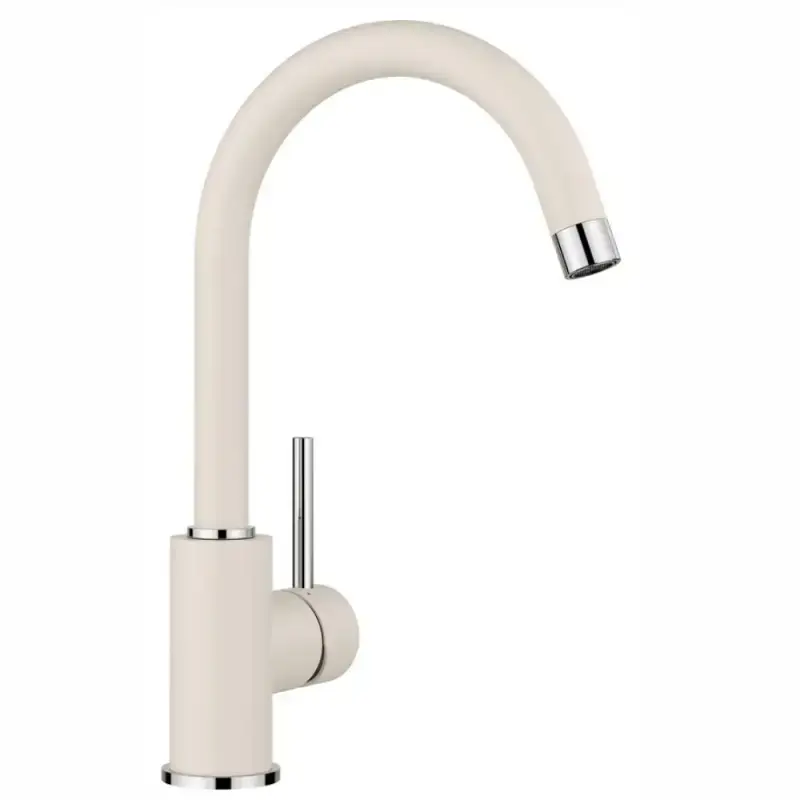 Blanco MIDA i farven soft white er et stilrent og kompakt køkkenarmatur med et elegant, buet design. Det er særligt velegnet til mindre vaske, hvor både funktion og æstetik er vigtige. Den høje tud gør det nemt at fylde store beholdere som vaser og gryder, mens 360° svingradius giver dig fuld bevægelsesfrihed i hverdagen. Overfladen i Silgranit-look matcher BLANCOs vaske i samme farve og sikrer et harmonisk udtryk i køkkenet.