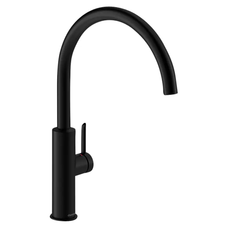 Moderne køkkenarmatur med koldstart og vandbesparelse – Damixa Iris køkkenarmatur i mat sort kombinerer skarpt, moderne design med funktionelle løsninger til det daglige køkkenarbejde. Armaturet er fremstillet i massiv messing og belagt med en mat PVD-overflade, som giver et markant og stilrent udtryk i køkkenet.