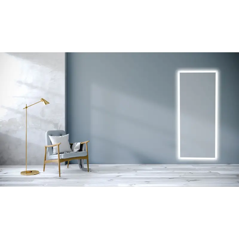 Dette smarte spejl har LED lys i fronten, og backlight lys der kaster lys op mod bagvæggen.