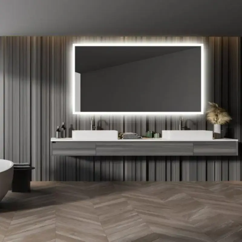 Dette smarte spejl har LED lys i fronten, og backlight lys der kaster lys op mod bagvæggen.