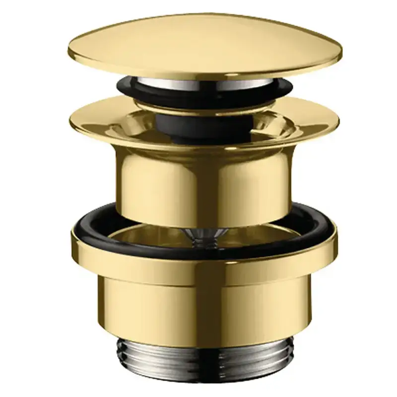 Tilføj en strejf af luksus og elegance til dit badeværelse med Hansgrohe Push-open bundventil 1 1/4" i poleret guld.
