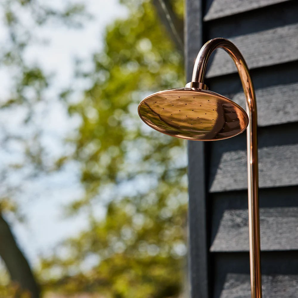 Denne væghængte udendørsbruser fra Frostline er fremstillet i massiv messing og er et stilfuldt valg til både private haver, sommerhuse og poolområder. Bruseren er designet til montering på vægge med en tykkelse på 15–35 cm og forener et elegant formsprog med funktionel robusthed, som passer ind i både moderne og klassiske udemiljøer.