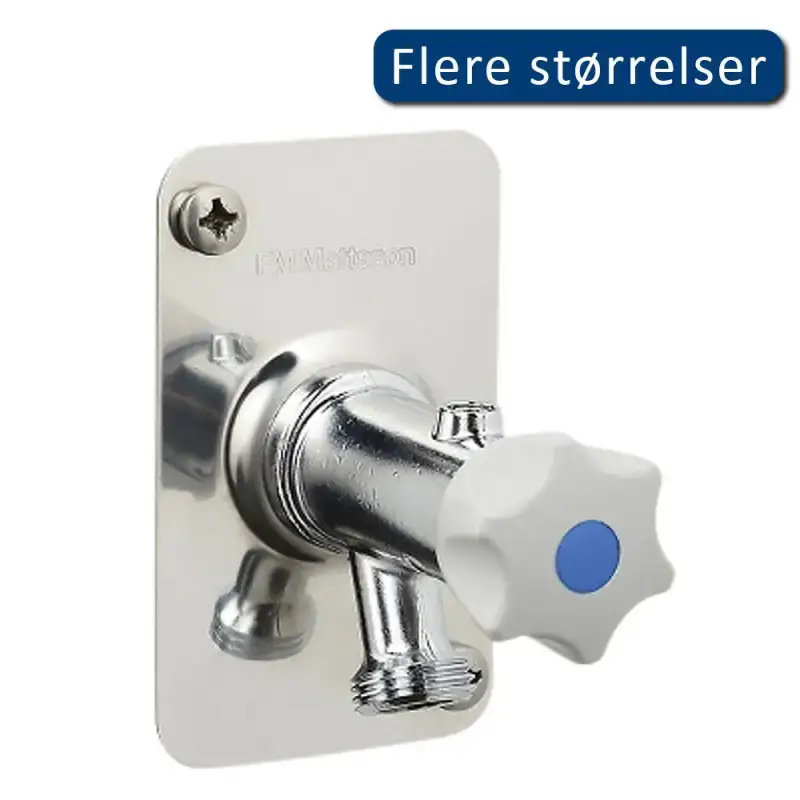 Til vægtykkelse på max 400 mm (afkortelig) Selvdrænende 1/2" af- og tilgang (nippel) Med plast greb Vægplade i rustfri stål 110x60 mm Hane forkromet messing Med kontraventil